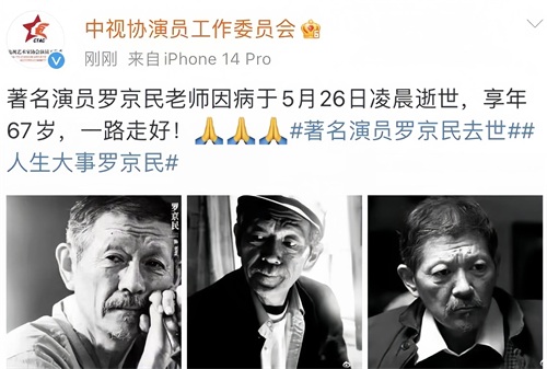 2023年5月26号,由中视协演员工作委员会发布消息称,著名演员罗京民老师因病在五月26号凌晨逝世,享年67岁,一路走好!