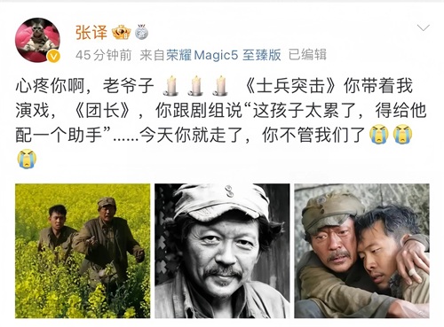 在罗京民离世的消息传出后,张译、张国强、王宝强、韩东君等与他曾有过合作的演员纷纷通过发文表达哀思。张译在他的发言中表达了对老爷子的深深怀念,并说道:“今年你就走了,你不管我们了”惹无数人掉泪,两人共合作了四部戏,可想张译的内心有多么悲伤。
