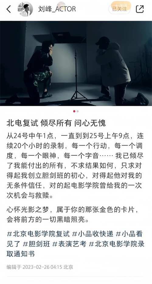 2023年2月26日他发布了一篇名为《北电复试,倾尽所有,问心无愧》的帖子,称自己从2月24日中午1点一直到25号上午9点,连续进行了20个小时的录制。“不求结果如何,只求对得起我创立胆剑班的初心,对得起他对我无条件的信任”。