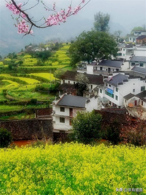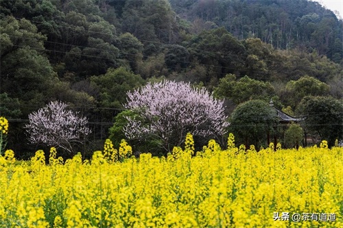 油菜花粉中含有丰富的花蜜,常引来彩蝶与蜜蜂飞舞于花间,由此平添了乡间田园缤纷的景致。三月中下旬,棵棵粉红的桃花、洁白的梨花点缀在漫山遍野金黄色的油菜花中,掩映着白墙灰瓦的徽派建筑,使得每一个逃离纷繁城市的人都能找到归宿。