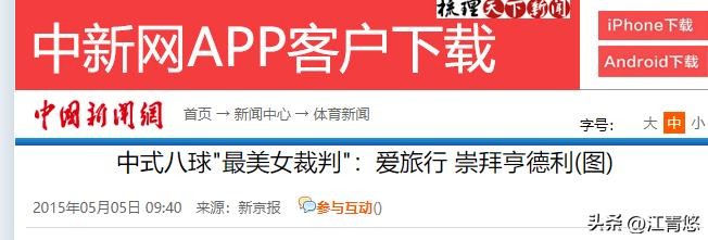 原文登载于中国新闻网 2015年05月05日关于中式八球"最美女裁判":爱旅行 崇拜亨德利(图)的报道