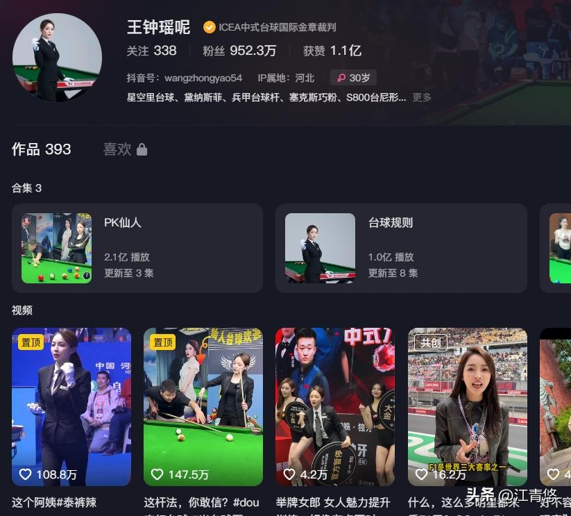 随着短视频的发展,王钟瑶也是专门注册了自己的社交平台号,并且每天也是专门分享一些台球的知识,而她也因此收获了952.3万的粉丝,更是作品获赞就高达1.1亿。