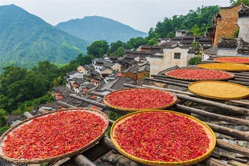层层叠叠的民居,错落有致,每家每户都晾晒着秋收的农作物,火红的辣椒,金黄的秋菊,还有玉米、南瓜,不可错过的乡村美景。