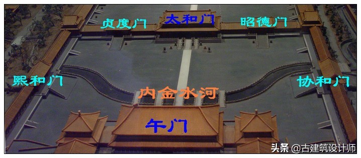 太和门前庭院是故宫中轴线上的第一进庭院,是故宫午门、太和殿两大高潮之间的过度庭院。太和门与东西两侧的廊庑间各设旁门一座,与太和门平排并列。东为昭德门,西为贞度门。两旁门南侧分列东西廊庑,围合出太和门外约四万余平方米的广庭。广庭中部偏南为内金水河,自西向东约200米,成弓形的弧度。河身从东西两边逐渐向中间加宽,形成月牙形的水面。河上并列跨有有五座石桥,直通午门。