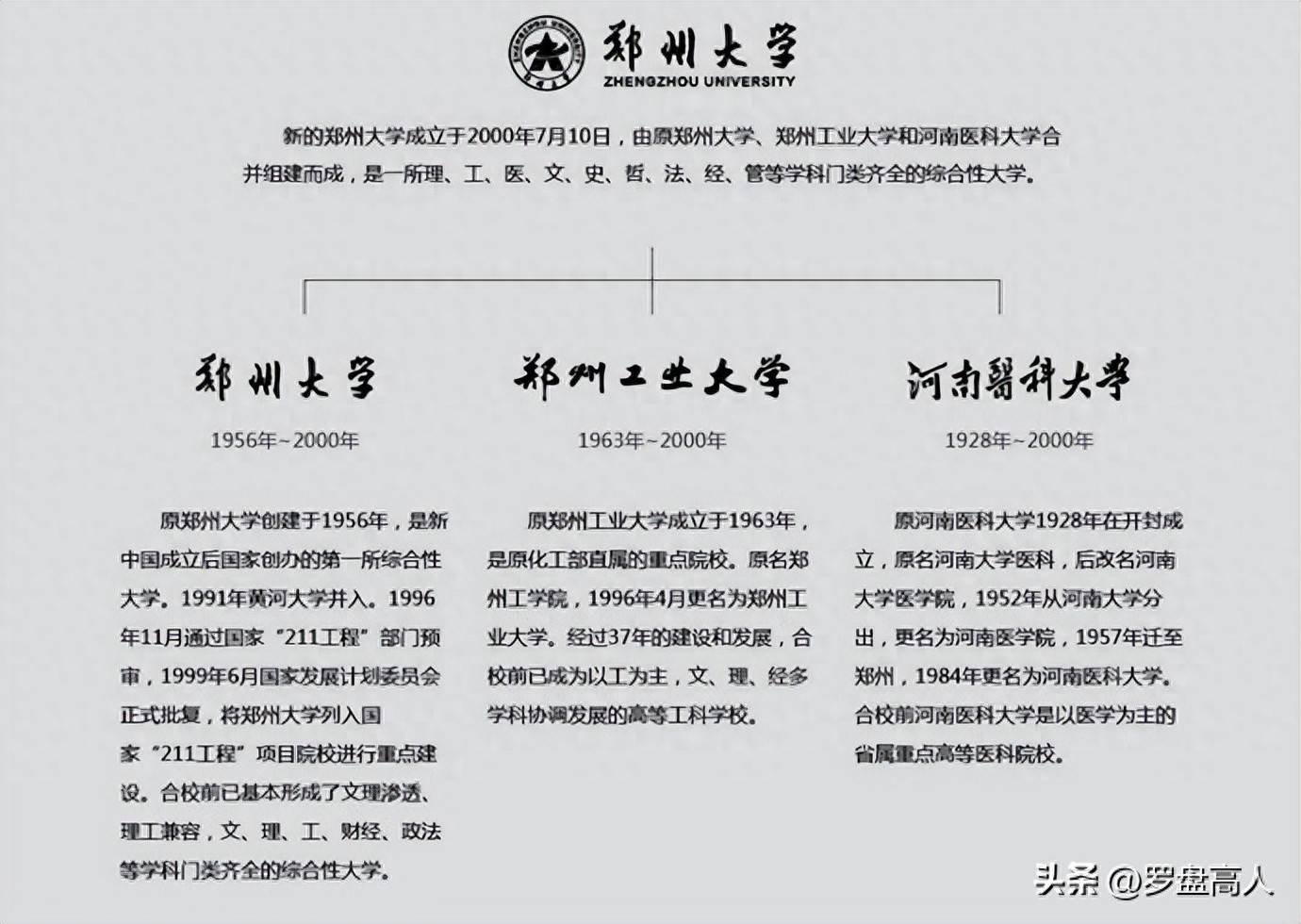 2000年7月10日,原郑州大学、郑州工业大学、河南医科大学合并组建新的郑州大学。