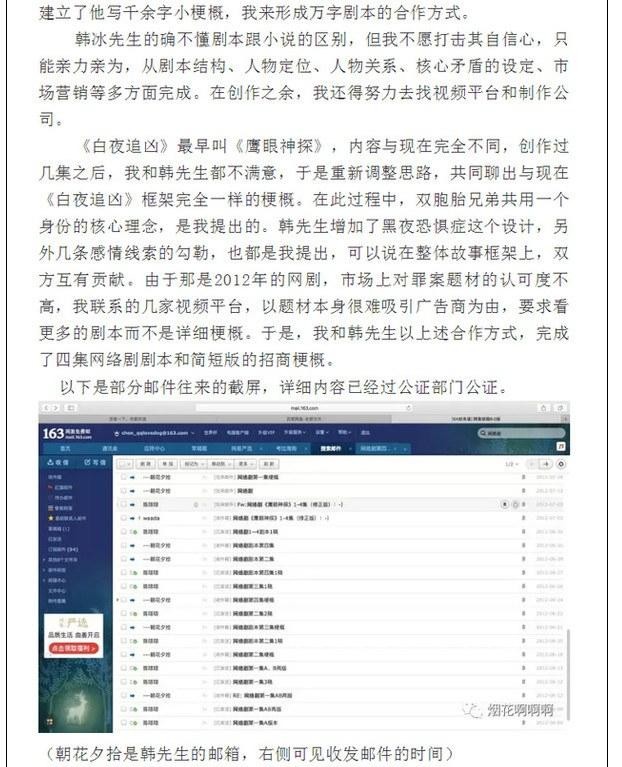 陈琼琼诉称,2012年,两人相恋期间共同开始了《白夜追凶》(当时名字《鹰眼神探》)的剧本创作,她称韩冰(指纹)是律师出身,并不懂得剧本的编写规律,身为职业编剧的自己是主要操刀人:“他写千余字小梗概,我来形成万字剧本的合作方式。”“韩冰先生的确不懂剧本跟小说的区别,但我不愿打击其自信心,只能亲力亲为,从剧本结构、人物定位、人物关系、核心矛盾的设定、市场营销等多方面完成。”