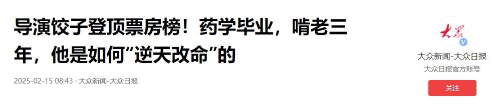 信息来源:大众新闻-大众日报 2025-02-15——《导演饺子登顶票房榜!药学毕业,啃老三年,他是如何“逆天改命”的》
