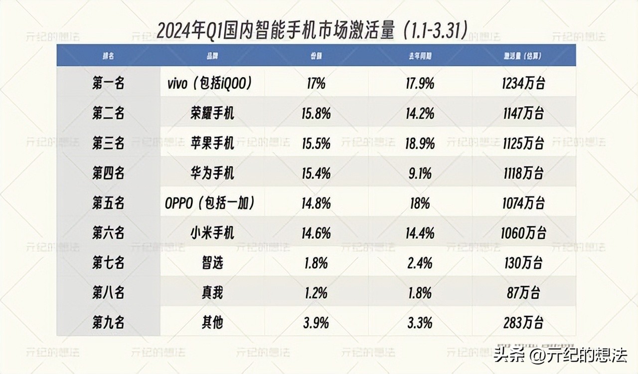排名第五的是OPPO手机(包括一加),它的出货量为2500万台,市场份额为8%,同比下跌5.7%。结合BCI的数据来看,OPPO在国内市场也出现了明显的下滑,如果后续再不努力的话被vivo反超也是很有可能的事情。从最近几周的激活量数据来看,OPPO手机的市场份额中规中矩,期待Reno12系列能够带来更好的成绩和销量吧。