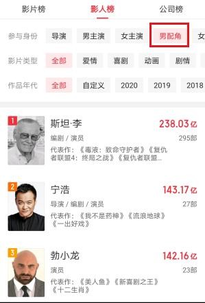 目前的9位中国百亿票房先生中,并非所有人都令人心服口服,因为尽管平台是按“男主演”来统计的个人票房成绩,但是有些上榜的演员却并非男主演,甚至男二号都算不上,只能算是配角,但平台数据库中另有“男配角”的票房数据,目前票房成绩排第一的是漫威创始人斯坦·李,票房高达238.03亿元,第二是中国导演宁浩(143.17亿元)。