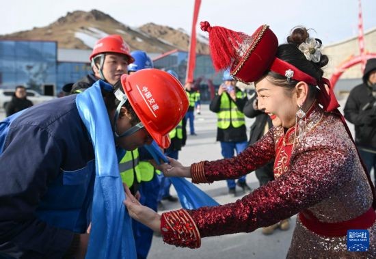 12月30日,在位于新疆和静县的天山胜利隧道出口,和静县乌兰牧骑队演员(右)向施工方代表敬献哈达。新华社记者 胡虎虎 摄