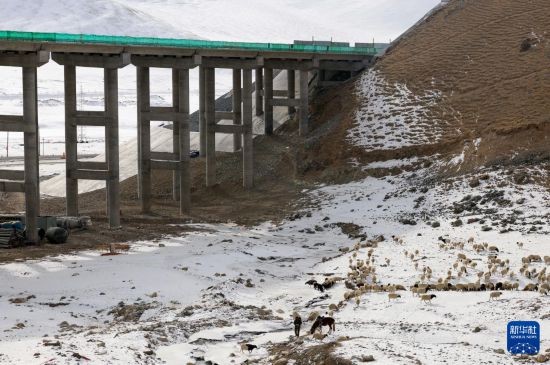 12月30日,在新疆和静县,牧民赶着羊群从在建的新疆乌尉(乌鲁木齐至尉犁)高速公路附近经过。新华社记者 王菲 摄