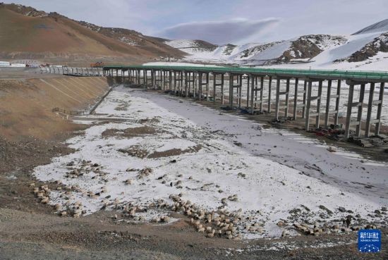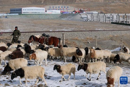 12月30日,在新疆和静县,牧民赶着羊群从天山胜利隧道出口附近经过。新华社记者 王菲 摄