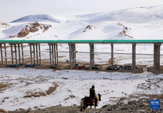 12月30日,在新疆和静县,牧民骑马从在建的新疆乌尉(乌鲁木齐至尉犁)高速公路附近经过。新华社记者 王菲 摄