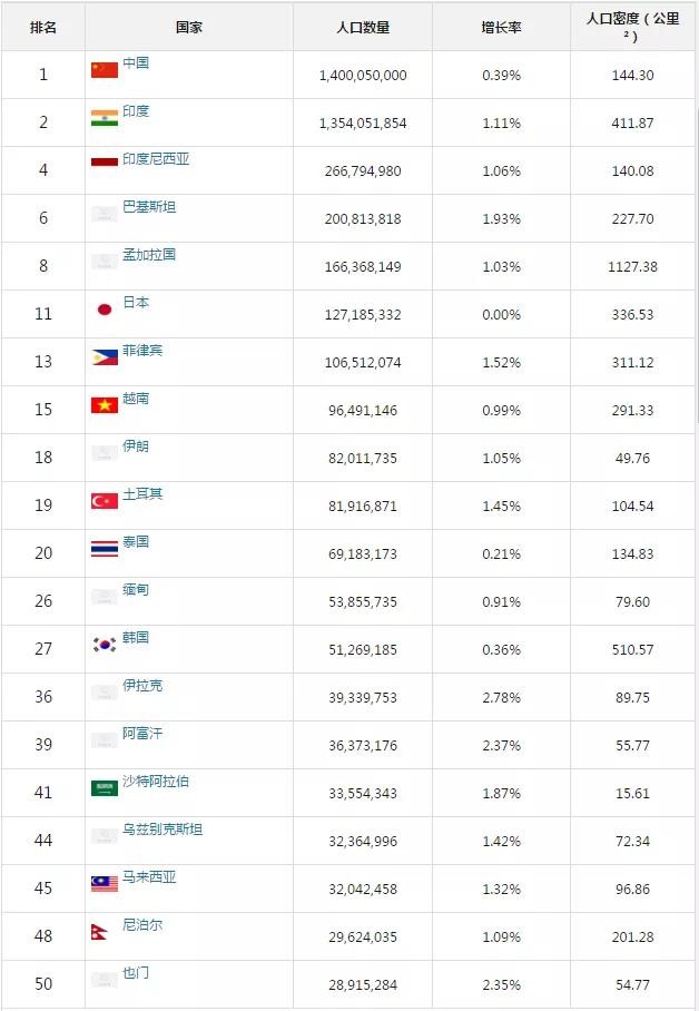 亚洲洲人口最多的国家是中国,人口总数为1400050000人,排名世界第1