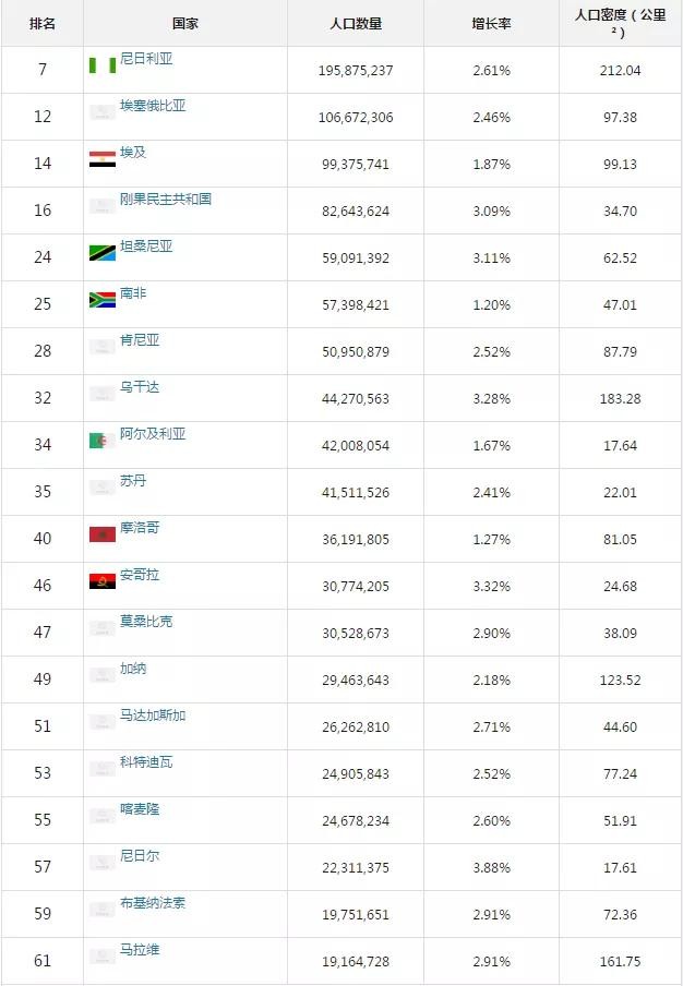 非洲人口最多的国家是尼日利亚,人口总数为195875237人,排名世界第7