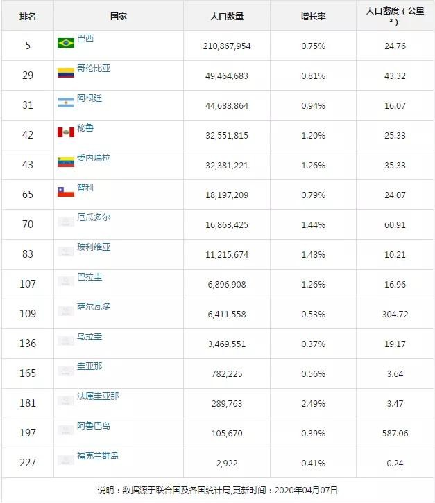 南美洲人口最多的国家是巴西,人口总数为210867954人,排名世界第5