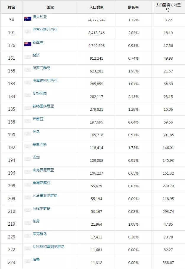 大洋洲洲人口最多的国家是澳大利亚,人口总数为24772247人,排名世界第54