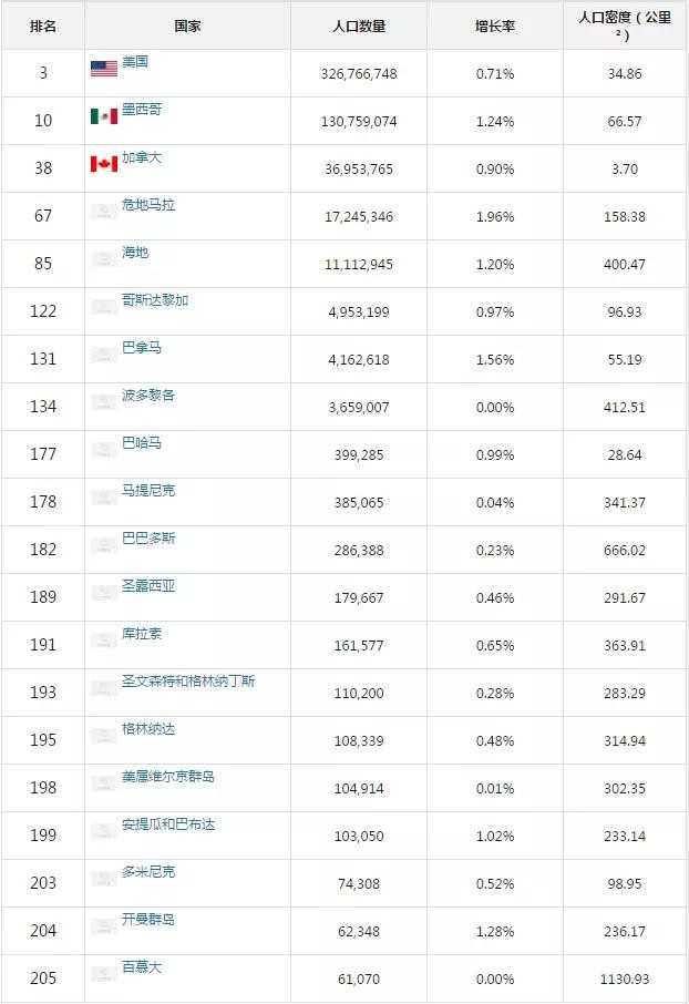 北美洲人口最多的国家是美国,人口总数为326766748人,排名世界第3