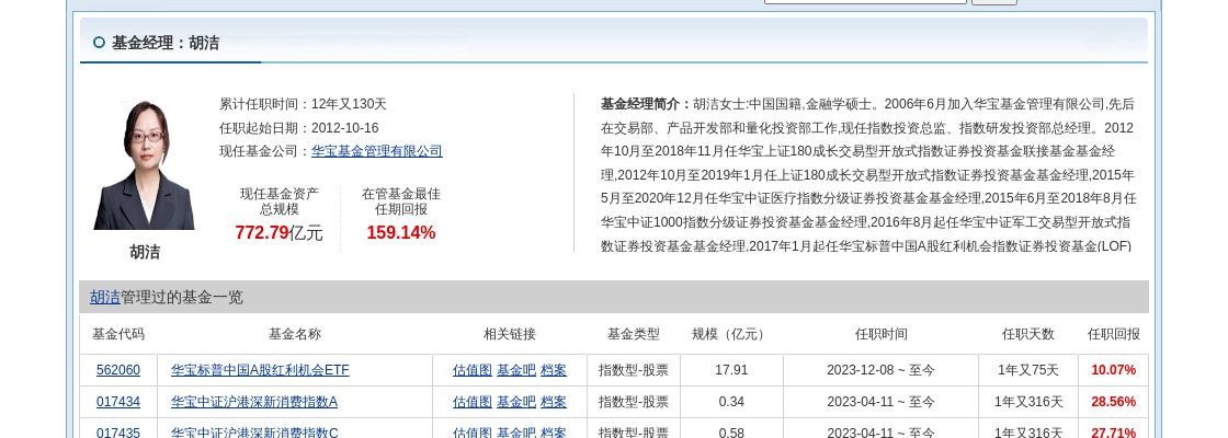 简历显示,胡洁女士:中国国籍,金融学硕士。2006年6月加入华宝基金管理有限公司,先后在交易部、产品开发部和量化投资部工作,现任指数投资总监、指数研发投资部总经理。2012年10月至2018年11月任华宝上证180成长交易型开放式指数证券投资基金联接基金基金经理,2012年10月至2019年1月任上证180成长交易型开放式指数证券投资基金基金经理,2015年5月至2020年12月任华宝中证医疗指数分级证券投资基金基金经理,2015年6月至2018年8月任华宝中证1000指数分级证券投资基金基金经理,2016年8月起任华宝中证军工交易型开放式指数证券投资基金基金经理,2017年1月起任华宝标普中国A股红利机会指数证券投资基金(LOF)基金经理,2017年7月起任华宝中证银行交易型开放式指数证券投资基金基金经理,2018年11月起任华宝中证银行交易型开放式指数证券投资基金联接基金基金经理,2019年1月至2021年3月任华宝标普中国A股质量价值指数证券投资基金(LOF)基金经理,2019年5月起任华宝中证医疗交易型开放式指数证券投资基金基金经理,2019年7月起任华宝中证科技龙头交易型开放式指数证券投资基金基金经理,2019年8月至2023年10月任华宝MSCI中国A股国际通ESG通用指数证券投资基金(LOF)基金经理,2019年8月起任华宝中证科技龙头交易型开放式指数证券投资基金发起式联接基金基金经理,2019年12月起任华宝中证消费龙头指数证券投资基金(LOF)基金经理,2021年1月至2021年5月任华宝中证医疗指数证券投资基金基金经理,2021年3月起任华宝中证全指证券公司交易型开放式指数证券投资基金、华宝中证全指证券公司交易型开放式指数证券投资基金发起式联接基金基金经理,2021年5月起任华宝中证医疗交易型开放式指数证券投资基金联接基金基金经理,2021年6月起任华宝中证科创创业50交易型开放式指数证券投资基金基金经理,2021年8月起任华宝中证科创创业50交易型开放式指数证券投资基金发起式联接基金基金经理,2021年9月起任华宝中证消费龙头交易型开放式指数证券投资基金基金经理。2023年4月起任华宝中证沪港深新消费指数型证券投资基金基金经理。2023年12月起任华宝标普中国A股红利机会交易型开放式指数证券投资基金基金经理。