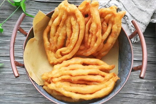 八股油条,江苏徐州著名地方小吃,以水面团制条,八条合拢,炸制而成。脆香可口,成形别致。因有八股,故称八股。在徐州已有100多年的历史。有车轮形和椭圆形两种。因成品色泽金黄、酥香味美、呈分布均匀状,故称之为八股油条。2000年被评为“中华名小吃”。