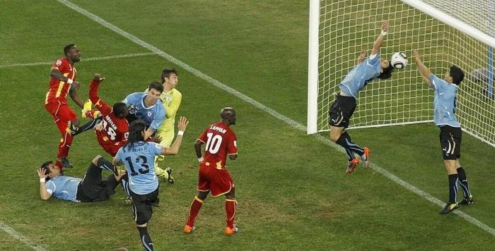 2010年南非世界杯四分之一决赛,加纳对阵乌拉圭。常规时间战至1:1,加时赛最后时刻,加纳获得前场任意球,乌拉圭门将出击判断失误,门前一片空荡,混乱之中苏亚雷斯先是用脚挡住门前一击,加纳前锋阿迪亚头球补射,情急之下苏亚雷斯伸手拦住了球,被红牌罚下,加纳队获得点球。但主罚点球的加纳前锋一脚踢飞,没能罚进,比赛拖入点球大战。最终乌拉圭4:2击败加纳。苏亚雷斯利用打排球的动作,将必进之球扑出,挽救了球队,最终淘汰对手。