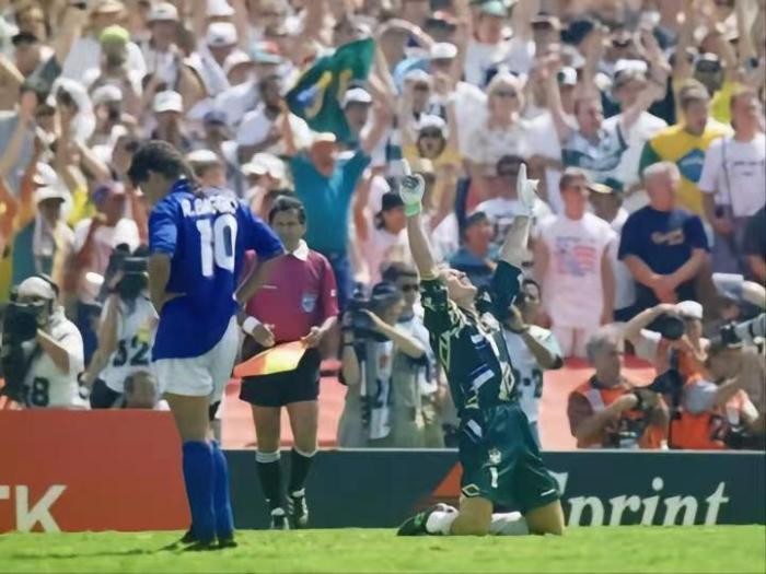 1994年世界杯决赛,此前同为三次夺冠的巴西与意大利会师决赛,势均力敌的两队贡献了精彩的120分钟,但比分仍旧是0-0,世界杯决赛也迎来了历史上首次点球大战。点球大战4轮过后,巴西以3-2领先,意大利命悬一线。罗伯特-巴乔走向罚球点,然而却一脚射门直接高出了横梁,将冠军送给对手。罚丢点球后的巴乔只是低着头,双手叉腰,落寞地站在点球点一旁,身后是沮丧倒地的队友,面前则是欢呼雀跃的球迷,以及跪地庆祝的巴西门将塔法雷尔。