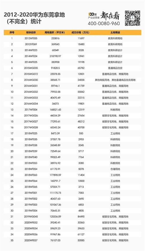 为满足企业所需,据选址960不完全统计,从2012年到2020年华为在东莞拿地35宗、金额超过70亿元,其拿地类型包括工业用地、科研用地、仓储用地、人才房用地等。(信息来源:东莞市公共资源交易网、东莞自然资源局网站)