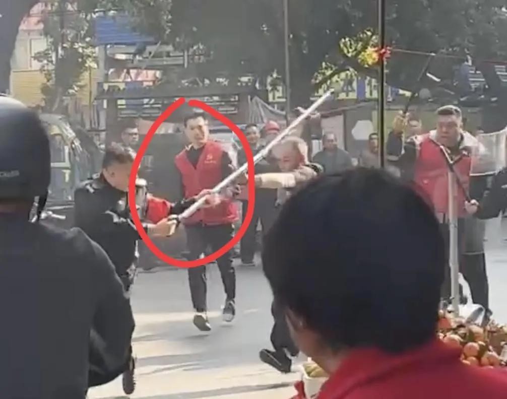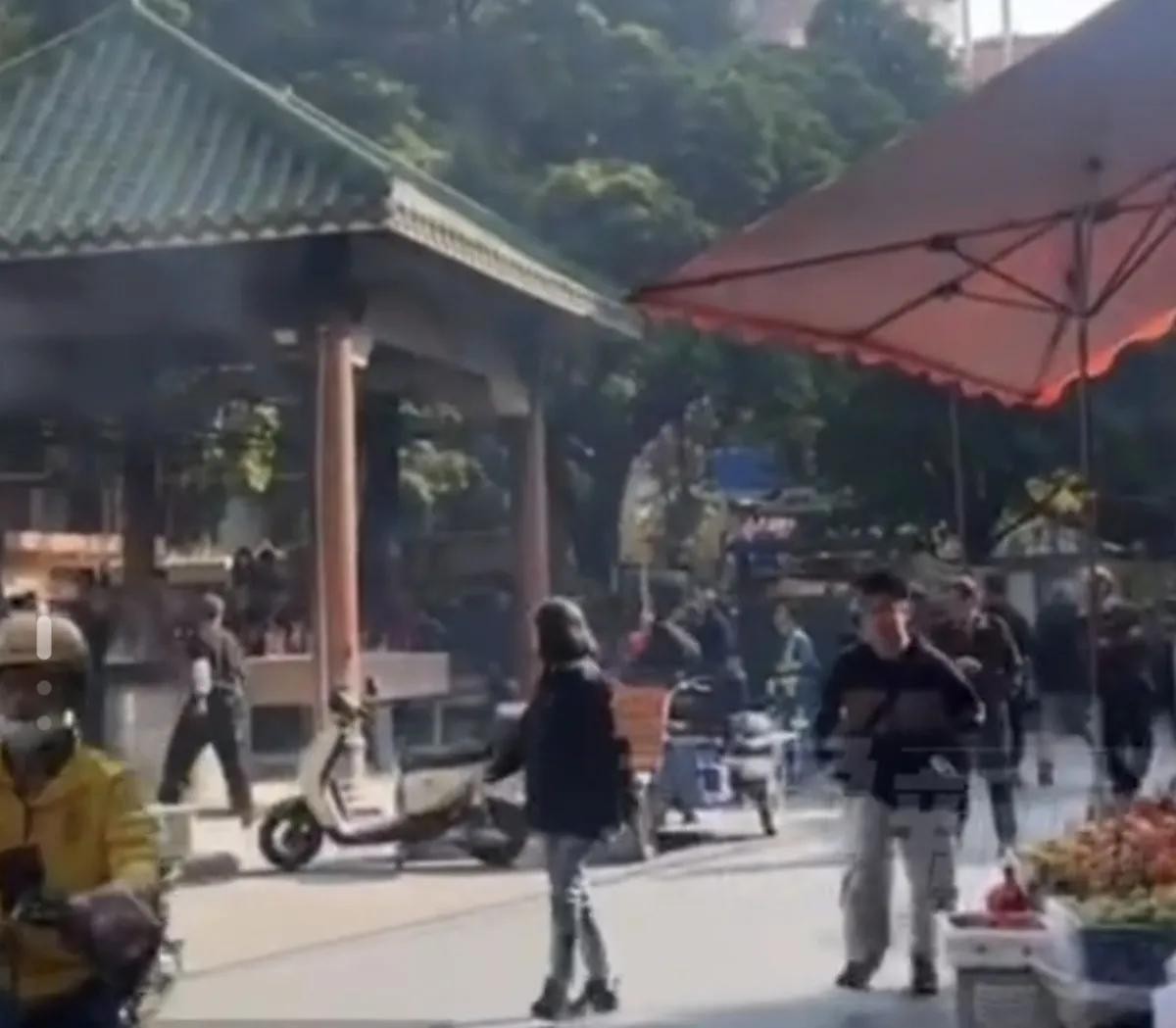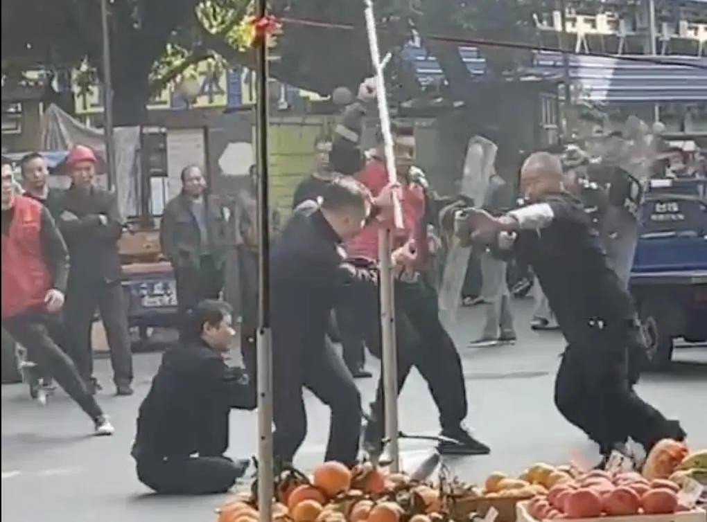 从视频中看,应该是处在一个闹市区,周围还有卖水果的,有不少居民还在周围看。