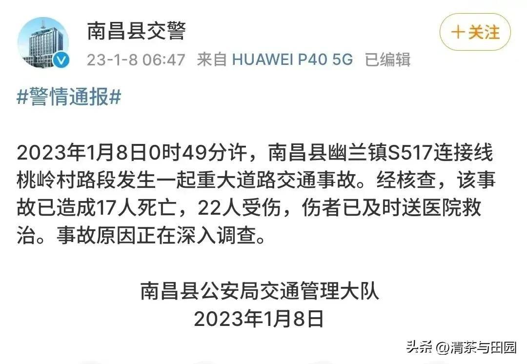 2023年1月8号凌晨,在江西省南昌县幽兰镇S517连接线发生一起交通事故,目前已致19人死亡。