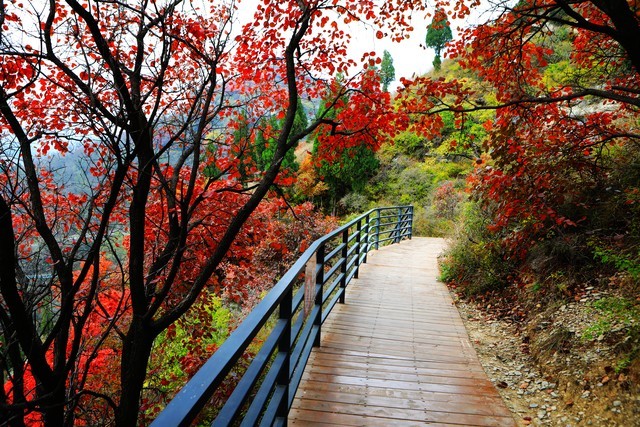 团风红颜景区,是自然爱好者的天堂,尤其是在秋季,这里的红叶景色美不胜收 。当秋风拂过,漫山遍野的枫叶、栎树、柿树等纷纷换上红装,红、橙、黄、橘等各种色彩交织在一起,仿佛一幅绚丽的油画 。沿着山间小径漫步,脚下是厚厚的落叶,发出沙沙的声响,头顶是斑斓的红叶,阳光透过树叶的缝隙洒下,形成一道道金色的光束,如梦似幻 。在这里,你可以尽情享受大自然的美景,用相机记录下每一个精彩瞬间,让人流连忘返 。