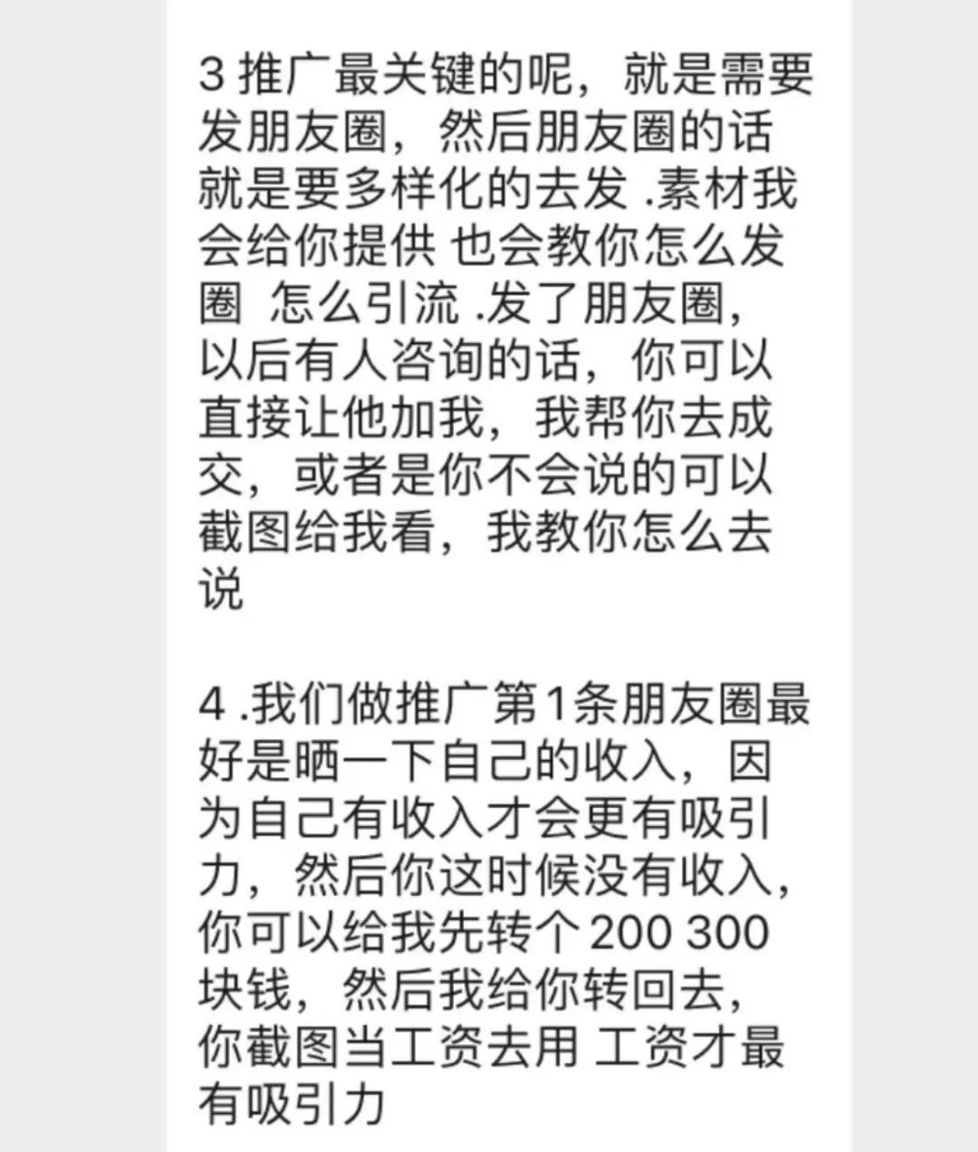 杨女士说:“根本都赚不到钱啊,有一个人干了一个月挣了二十还是三十,有的做好几个月根本就挣不着钱。团长他都告诉我,咋多挣钱?比如说,一天一发工资,今天我先给他二百、三百的,他再转给我,我收了以后,就截个屏发朋友圈里了——这是我今天挣的工资,在你的微信朋友圈里,只要有一个新人加入,你就可以赚取三百块钱的佣金。”