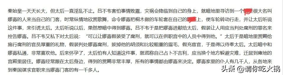 《史记》原文记载:始皇帝益壮,太后淫不止。吕不韦恐觉祸及己,乃私求大阴【大阴:大生殖器。】人嫪毐以为舍人,时纵倡乐,使毐以其阴关【关:穿。】桐轮而行,令太后闻之,以啖【啖:吃,喂,引诱。】太后。太后闻,果欲私得之。吕不韦乃进嫪毐,诈令人以腐罪【腐罪:指应判处腐刑(即宫刑)的罪。】告之。不韦又阴谓太后曰:“可事诈腐,则得给事中。”太后乃阴厚赐主腐者吏,诈论之,拔其须眉为宦者,遂得侍太后。太后私与通,绝爱之。有身,太后恐人知之,诈卜当避时,徙宫居雍。嫪毐常从,赏赐甚厚,事皆决于嫪毐。嫪毐家僮数千人,诸客求宦为嫪毐舍人千余人。