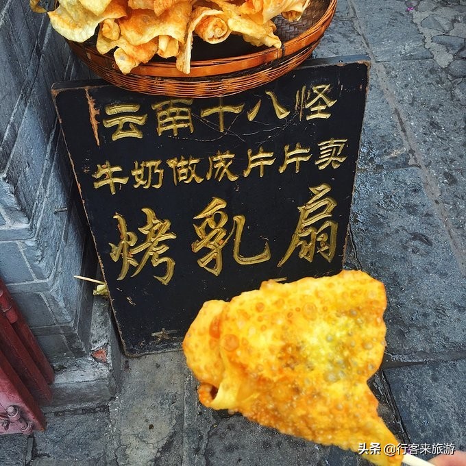 云南十八怪,牛奶做成片片卖。桃仁夹沙乳扇,酥脆香甜,奶香异常,富于营养。如果你到大理,走到街头你随处都可以买得到,新鲜乳扇或烤乳扇。烤乳扇是只有在大理才可得的独特味道。稍稍冷却后的烤乳扇又有另一番滋味,嚼起来多了几分韧性,奶味更浓,霸道得让一些平时少饮奶制品的人难以适应。所以平时不敢吃的同学,一定要试试哟,错过不再有了。