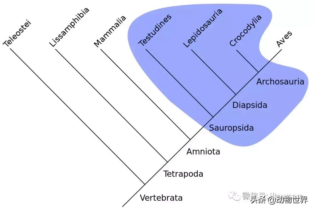 图中分支顶端由左至右分别为鱼类、两栖类、哺乳类、爬行类(龟类、鳞龙类、鳄类)与鸟类,蓝色部分是爬行类,该类群以较晚近的研究结果而言,因不包含其共同祖先的所有后代,因此是一个并系群。