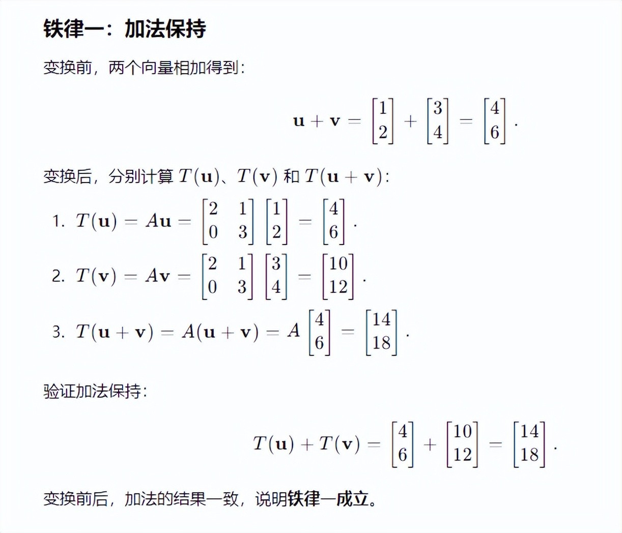 如果两个向量 u 和 v在变换前可以加起来,那么它们变换后的结果也可以直接相加。这就像你站在一块变形的网格纸上,两个点的连线长度在变换前后始终遵循相同的比例。