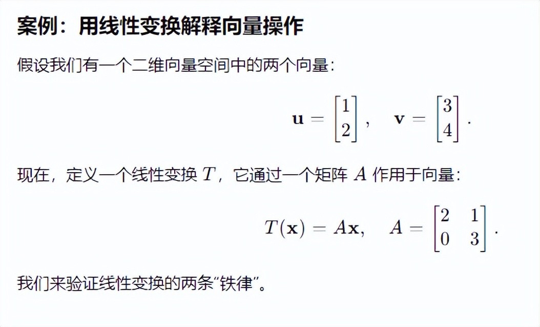 加法保持:想象两幅图案(对应 u和 v)在布料上,无论布料如何拉伸(对应 A 的作用),图案间的相对位置不变。数乘保持:如同用望远镜看山峰,无论如何调整焦距(对应 c的放大或缩小),山的比例不会改变。