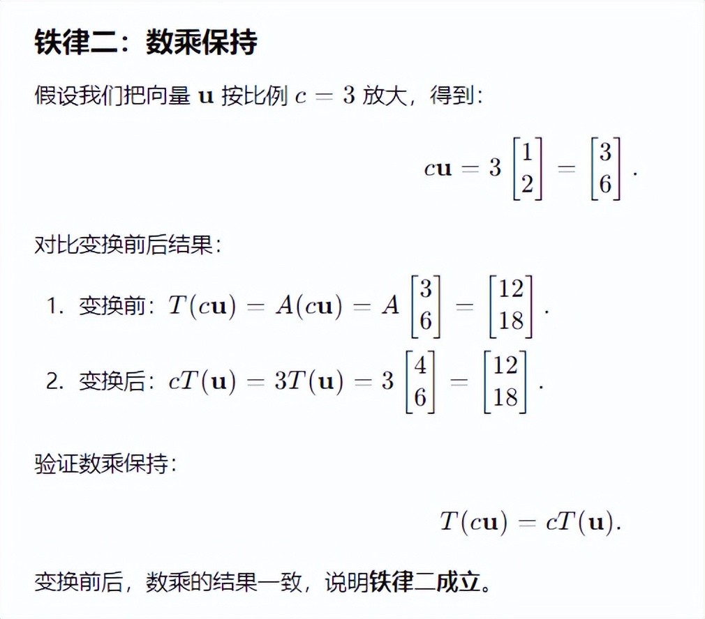 如果一个向量被一个数 c放大或缩小,那么变换后的向量也会被同样地放大或缩小。这意味着线性变换对比例关系是忠实的,哪怕空间本身被拉得千奇百怪。