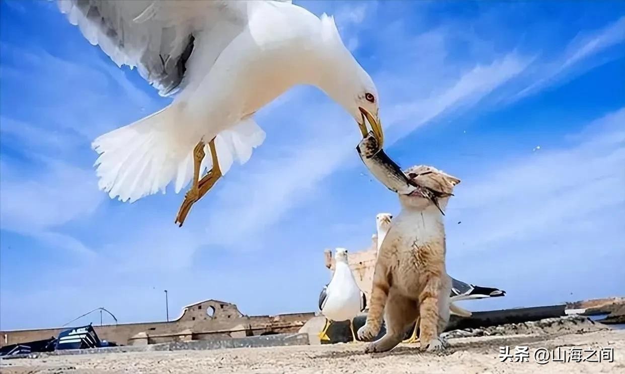 21.海滩上的这只海鸥,竟然抢了小猫嘴里的鱼!这画面太戏剧性了,猫估计得气得直跺脚。