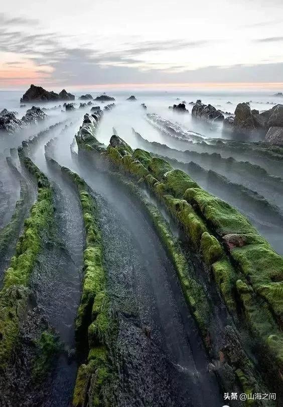7.扎马亚海滩位于西班牙北部,石头形成的理石岩层看得人直呼神奇,像是地球的“年轮”,记录着亿万年的地质变化
