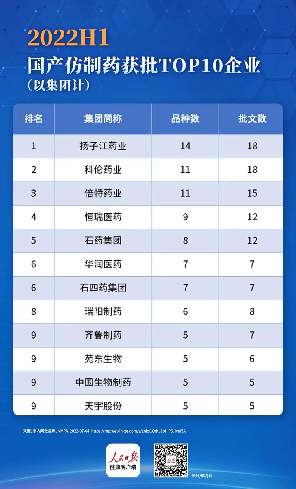 据米内网数据,2022上半年国家药监局共批准471个国产仿制药批文,涉及210个品种。仿制药获品种前十批企业中,扬子江药业以14个品种稳居榜首;科伦药业、倍特药业并列第二,各有11个品种获批上市;恒瑞医药、石药集团分别位列第四、第五。