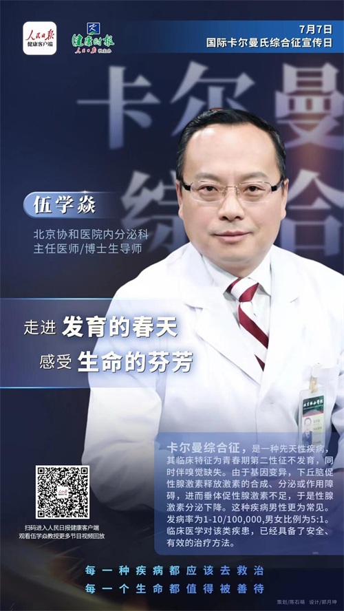 7月7日是国际卡尔曼氏综合征宣传日。卡尔曼综合征是一种先天性疾病,其临床特征为青春期第二性征不发育,同时伴嗅觉缺失。由于基因变异,下丘脑促性腺激素释放激素的合成、分泌或作用障碍,进而垂体促性腺激素不足,于是性腺激素分泌下降。这种疾病男性更为常见。临床医学对该类疾患,已经具备了安全、有效的治疗方法。