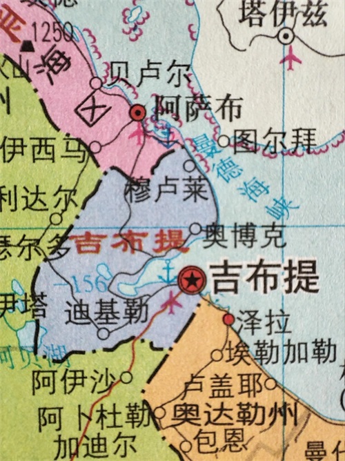 【地理】 地处非洲东北部亚丁湾西岸,扼红海进入印度洋的要冲曼德海峡,东南同索马里接壤,北与厄立特里亚为邻,西部、西南及南部与埃塞俄比亚毗连。陆地边界线长520公里,海岸线长372公里。沿海为平原和高原,主要属热带沙漠气候,终年炎热少雨。内地以高原和山地为主,属热带草原气候。全年分凉、热两季。4月至10月为热季,平均气温37℃,最高气温达45℃以上;11月至次年3月为凉季,平均气温27℃。