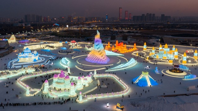 哈尔滨冰雪大世界位于哈尔滨市,是一处以冰雪为主题的乐园。