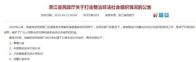 2019年6月12日,浙江省民政厅对外通报了2019年以来,各级民政部门公布的已经被打击处理了22家非法社会组织名单。其中,世界环保志愿者协会赫然在列,排列在第七位。