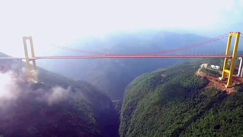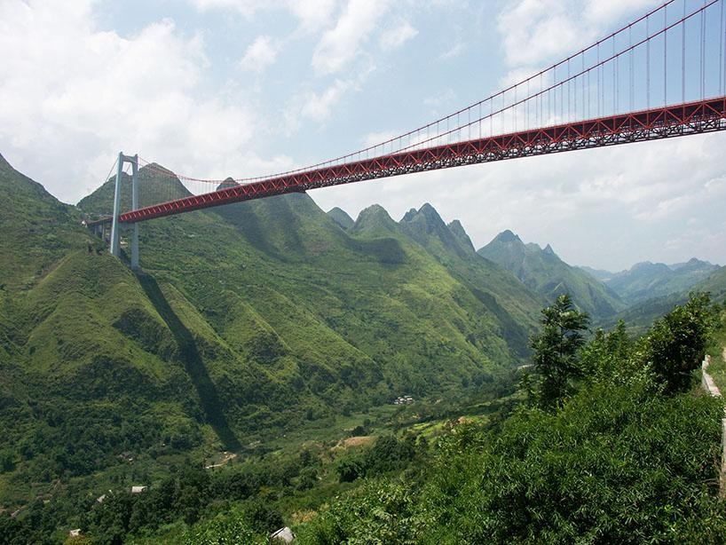 图片由highestbridges.com网站的Eric Sakowski提供 当中国工程师们似乎醉心于玻璃栈道的时候,他们同时也是建设高海拔桥梁的专家。按照世界最高桥梁的标准来评判的话,普立特大桥仅次于位于中国中部的湖北省世界上已竣工的最高悬索桥——壮观的四渡河大桥(1627英尺高),成为世界已竣工第二高的桥梁。发布这个航拍视频的网站还另外列举出了全球十大最高桥梁项目,其中有八座都是位于中国境内。让人不禁感慨中国的桥梁建筑水平。