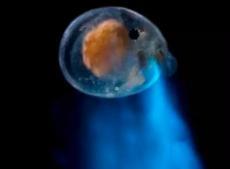 如果不幸被敌人吞下肚,介形虫就会立刻开启互相伤害模式。它们会喷出大量荧光液体,把对方的身体照得像个透亮的蓝色小灯笼。为了不成为更强大捕食者的显眼目标,暗色天竺鲷只得立即把介形虫吐出来,这就是我们在那些“喷火鱼”视频中看到的有趣一幕。