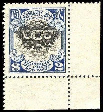 1913年宫门倒印票1913年首次发行中华民国邮票,面值为分、角、圆。全套有19种面值。该票为铜版双色套印。分值图案为帆船。