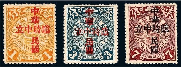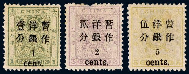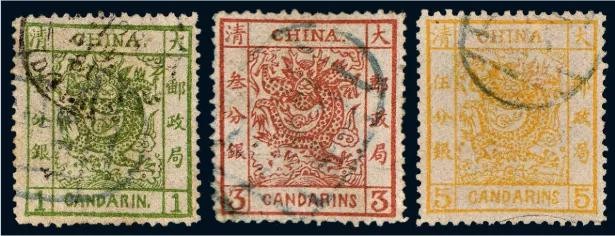 1878年开始发行的三期海关大龙票第一期1878始发,共三枚,1分(绿色)、3分(红色)、5分(黄色),半透明薄纸。