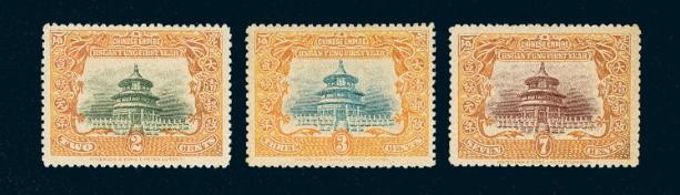 1909年发行的宣统登基纪念票1909年9月8日发行,2、3、7分三枚,中心图案为天坛,票上有英文“伦敦华德罗公司”字样,该公司雕刻双色套印而成,横23~24齿牙,竖 12~13齿牙。