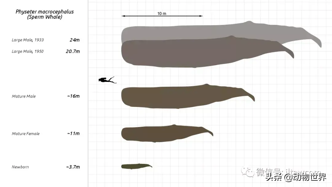 抹香鲸是体型最大的齿鲸,具有明显的雌雄二型性,雄型的体型较大。